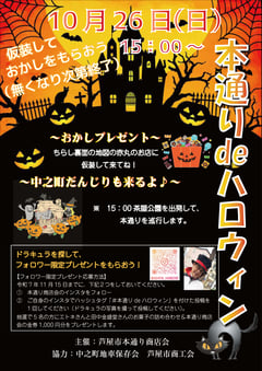 仮装をして10月26日(日)に本通りに来てくれた子ども達には、15時~お菓子をプレゼントします。