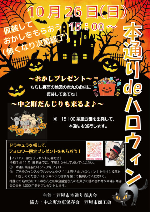 当日は、商店会の会長が大きなドラキュラに変身していますので、このドラキュラの写真を撮って、#本通りdeハロウィン というハッシュタグをつけてインスタグラムに投稿してくれた方(+本通り商店会のインスタもフォローしておいてください)の中から抽選で、素敵なプレゼントをしますので、ぜひドラキュラさんも探してくださいね。