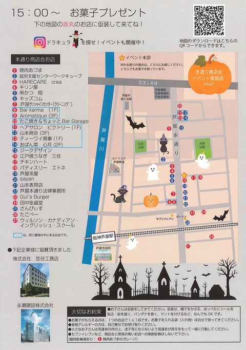 お菓子は地図の赤い番号のお店で配ります。