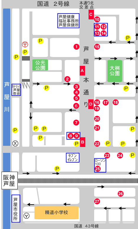 JR線と阪神線の間に位置する芦屋市本通り商店会には、25店舗以上のお店が加入しています。